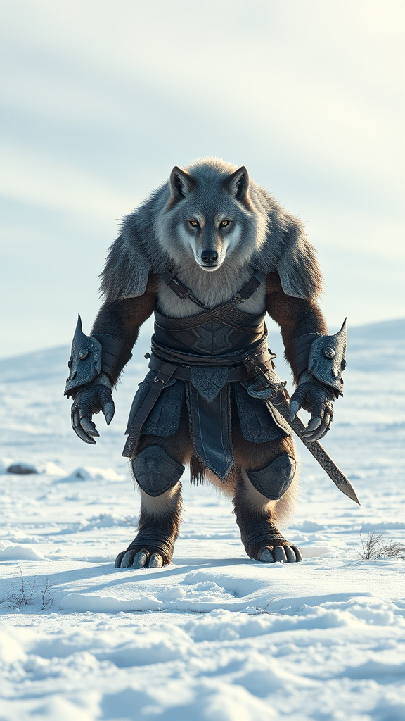 In a vast snowy landscape, stands a formidable wolf-like warrior character, an anthropomorphic figure that evokes the essence of a fantasy realm, reminiscent of D&D adventures. This creature exudes an aura of strength and nobility, its fur bristling in the icy air. Its eyes, piercing and intelligent, reflect a lifetime of battles fought and won. The scene is captured with masterful realism, each detail meticulously rendered to create a hyper-detailed, lifelike representation. Cinematic lighting casts dramatic shadows across the snow, highlighting the contours of the wolf warrior’s muscular form. The entire composition unfolds in stunning 32k UHD quality, with an aspect ratio of 9:16, ensuring an immersive viewing experience that draws the observer into this frozen, ethereal world.