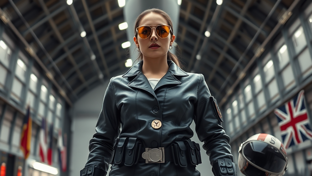 In a vast spacecraft hangar, a heroic female mechanic stands poised, exuding strength and confidence. She wears an intricately detailed formal uniform featuring Oak Cool Pewter leather, embodying the fusion of sci-fi and cyberpunk aesthetics. Her attire is adorned with medals and a utility belt filled with advanced tools, suggesting expertise and dedication. The dynamic action posture she holds is captured in a low-angle shot, accentuating her stature and authority. Dramatic cinematic lighting highlights her vigilant expression and the highest facial details. Golden pilot sunglasses rest on her face, adding an air of mystery and style. The uniform displays realistic fabric details and folds, with rich textures enhancing its futuristic design. Behind her, a simple background features the subtle presence of hard surfaces and flags, like the stars and stripes and the union jack, hinting at her alliances. A helmet nearby suggests readiness for any challenge. The scene is in 8k, ensuring a masterpiece quality with such detail that it feels alive. The composition emphasizes a stark contrast between the subject and her surroundings, making her the undeniable focal point.
