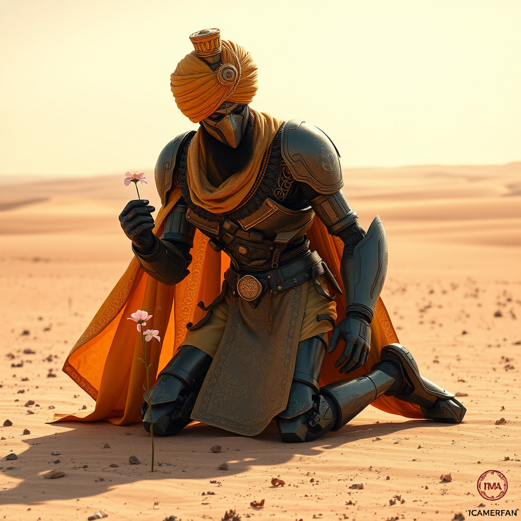In a vast, sunlit desert, a Sikh king from the 1800s kneels gracefully, adorned in a magnificent turban and a neo-futuristic Japanese mecha exoskeleton gundam suit, echoing the intricate style of Warhammer. A long, ornate cape flows behind him as he carefully picks a delicate flower from the barren earth, a symbol of serene beauty amidst desolation. His carbon fiber exoskeleton is intricately engraved with golden Punjabi letters, imbuing the suit with mystical energies. The fusion of modern history and advanced technology creates a captivating harmony, reminiscent of Billelis's dramatic artistry. His face is concealed by a metallic mask, offering a sense of mystery. Inspired by the imaginative worlds of Akira and the epic narratives of Star Wars, the detailed craftsmanship of the suit reflects the artistic influences of Norman Rockwell, Syd Mead, Boris Vallejo, Jean Giraud Moebius, John Berkey, Eugéne Delacroix, and Rembrandt Van Rijn. Each blink-and-miss detail in the scene pays homage to Akira Kurosawa's storytelling precision. In this peaceful and endless desert landscape, the timeless elegance of history and the awe-inspiring marvel of future technology merge seamlessly, creating a romanticized vision of what was and what could be.
