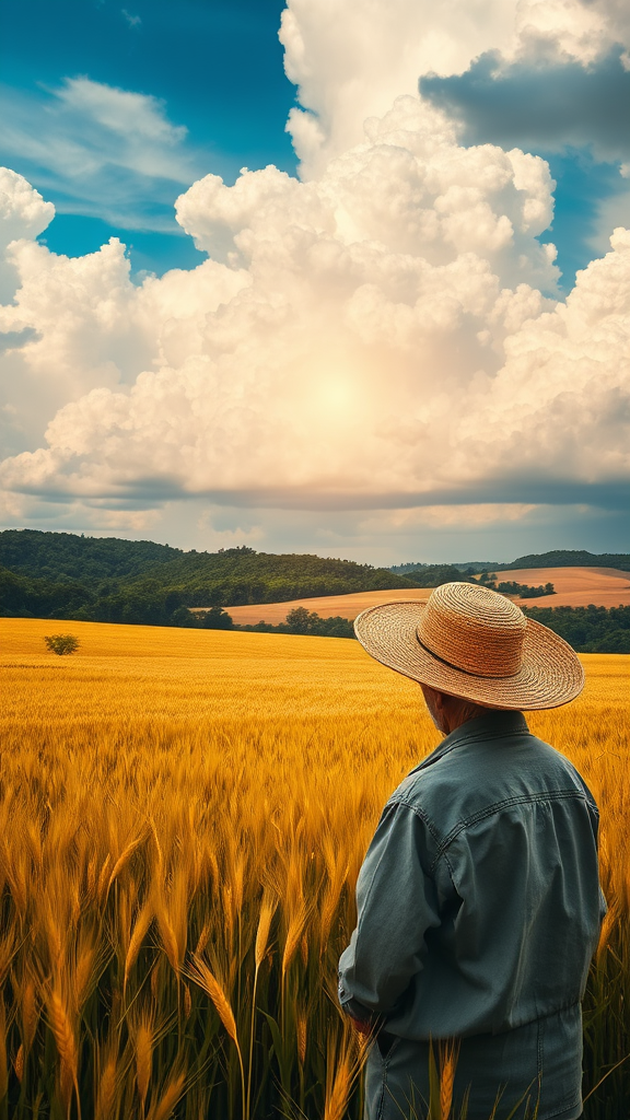 In a vast wheat field under a dramatic expanse of big, fluffy clouds, an elderly farmer with a well-worn straw hat gazes thoughtfully over the golden expanse. The sky is a vibrant blue, with occasional rays of sunlight breaking through. Adjacent lies a lush rice field, where neat rows of rice seedlings stand in pristine order. Beyond, a dense forest borders the fields, with soft hills rolling gently into the distance. The scene feels secluded and rural, captured in ultra-high definition with intricate detail. The soft light of the setting sun creates a magical atmosphere, with deep field focus and delicate bokeh lending a cinematic, surreal quality to the view. The landscape appears almost otherworldly, as if touched by the gentle brush of surrealism, complete with a realistic rendering akin to ray tracing.