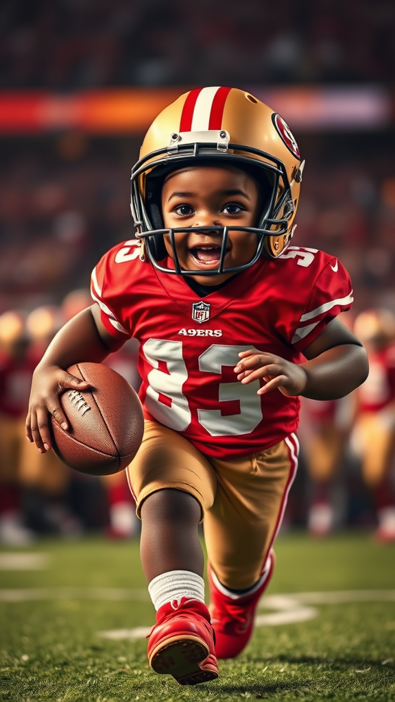 In a vibrant and captivating scene, a young African American toddler, wearing the iconic red and gold San Francisco 49ers uniform and helmet, is captured in mid-action. The child joyfully runs while clutching a football, embodying the sheer excitement of scoring a touchdown. The scene is filled with a sense of triumph and exuberance, with dynamic, dramatic lighting highlighting the toddler's expressive features and movement. The setting is vibrant, with vivid colors and a sense of momentum that brings the moment to life. Shot with a Canon EOS-1D X Mark III, the photo is hyper-realistic, capturing every detail in stunning HD, and exudes the spirit of celebration and victory inherent in the sport.
