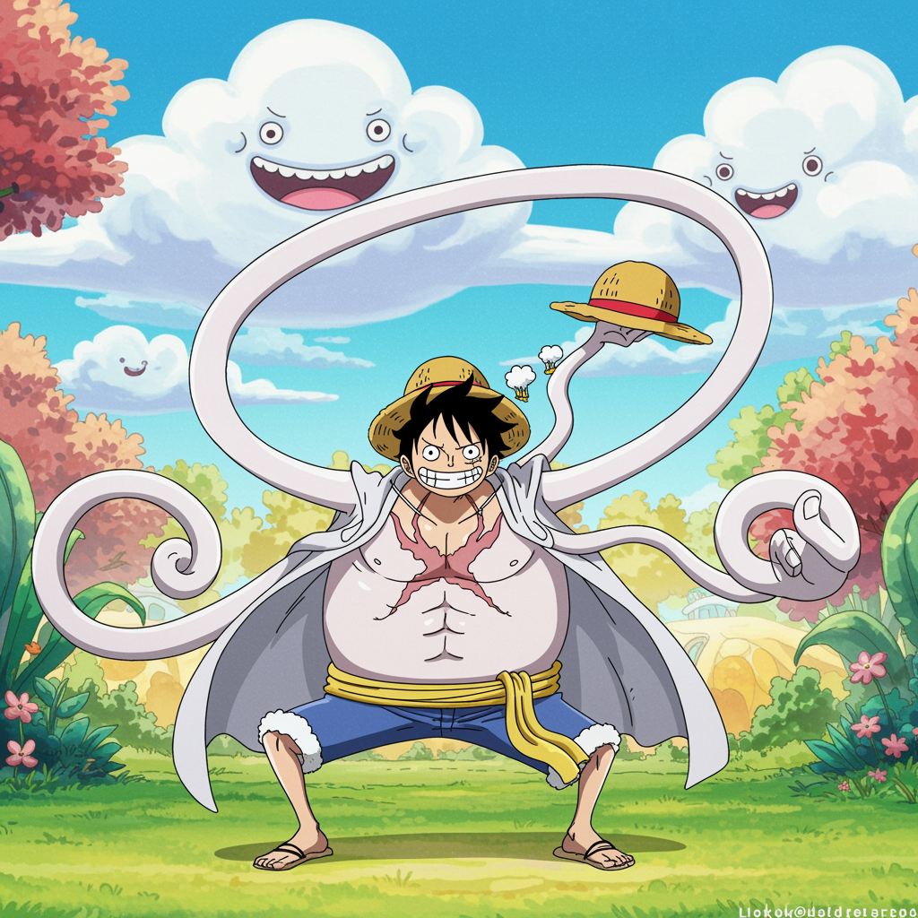 In a vibrant and fantastical world teeming with swirling colors and whimsical landscapes, Luffy from One Piece stands as the legendary God Nika, his pristine white form shimmering brilliantly in his Gear 5 transformation. His exaggerated, rubbery limbs stretch and twist comically into impossible shapes, showcasing his extraordinary elasticity with side-splitting humor. His eyes glisten with mischief, wide and animated, as his iconic straw hat nearly pops off his head from the exuberance of his movements. In the background, clouds form into cheeky faces, laughing along with his antics, while the lush, lively environment around him pulses with warmth and merriment. Luffy's playful expression captures the spirit of joyous adventure, and his dynamic pose exemplifies both power and hilarity. The scene is rendered with stunning detail, accentuating every whimsical aspect of this delightfully animated and imaginative setting.