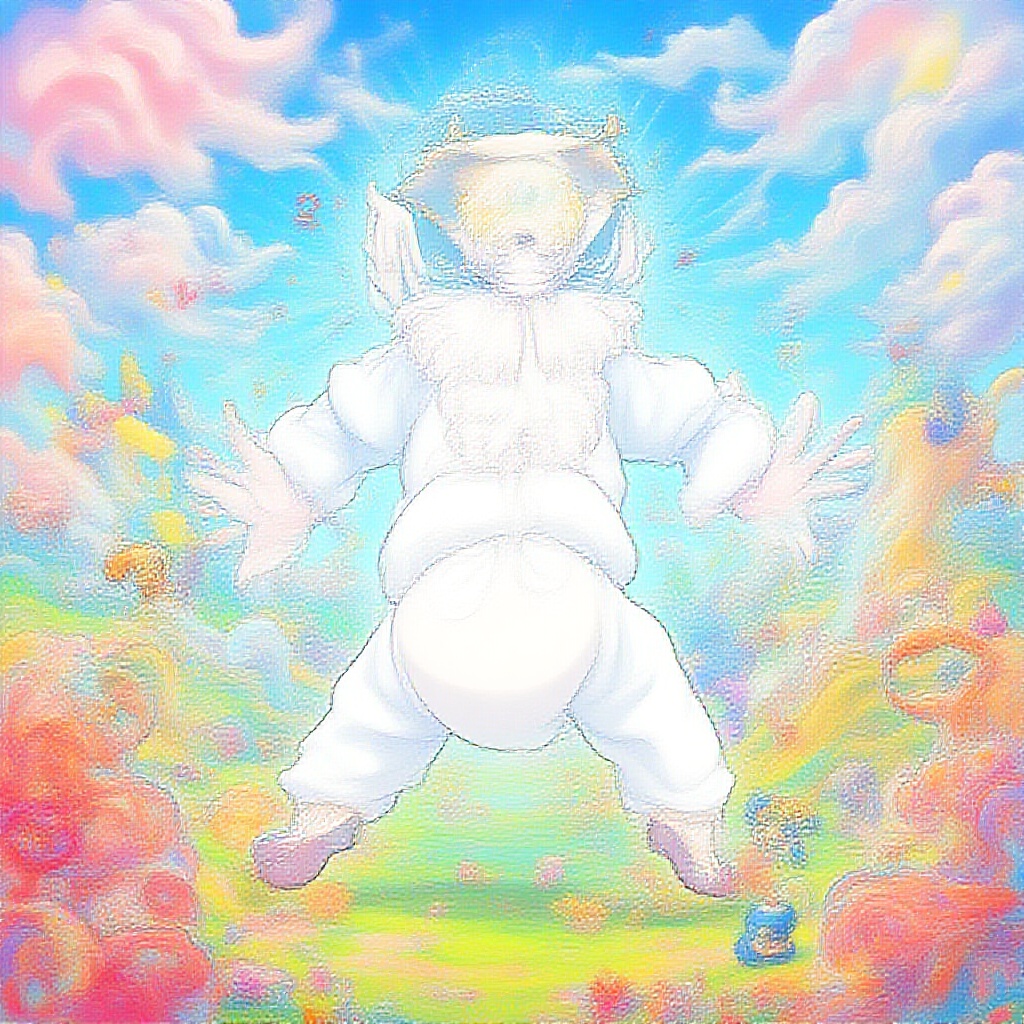 In a vibrant and whimsical setting filled with candy-colored clouds and surreal landscapes, Luffy from One Piece is depicted in his awe-inspiring Gear 5 transformation as the legendary God Nika. His pristine white form gleams under the sunlight, showcasing his extraordinary elasticity in a comically exaggerated fashion. Luffy's rubbery limbs are playfully stretched and twisted into impossible shapes, highlighting his boundless energy and spirited personality. Surrounding him is a lively scene with animated, fantastical creatures and dynamic bursts of color, enhancing the joyful chaos of the environment. The rendering employs advanced techniques to bring out intricate details, from the sheen on Luffy's form to the texture of the surreal surroundings, creating an aesthetically captivating and side-splitting masterpiece that captures the essence of Luffy's adventurous spirit. Small creative modifications, such as playful twists on his iconic straw hat and unique cloud formations, add originality to the piece while preserving its core concept.