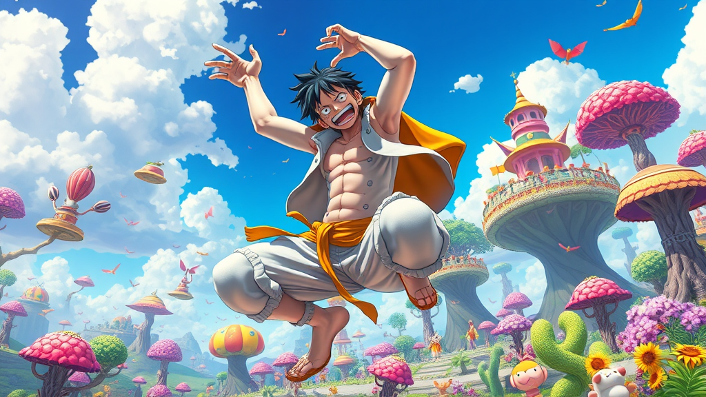 In a vibrant and whimsical world teeming with color and boundless imagination, the legendary pirate Luffy from One Piece takes center stage, showcasing his extraordinary elasticity in a side-splitting, uproarious display. Transformed into the legendary God Nika in his Gear 5 form, Luffy's pristine white appearance is captured with remarkable artistry, accentuating his exaggerated rubbery features for maximum comedic impact. His limbs stretch and twist in impossible directions with precision, as he engages in a series of entertaining antics that defy the rules of physics, setting the lively environment abuzz with laughter and awe. The picturesque landscape, filled with peculiar trees, vibrant skies, and floating islands, complements Luffy's dynamic presence, creating a scene of sheer fantastical delight. Cutting-edge rendering techniques bring this masterpiece to life, adding depth and texture to every contour, and allowing Luffy's animated expressions and buoyant spirit to resonate with unparalleled charm and humor.