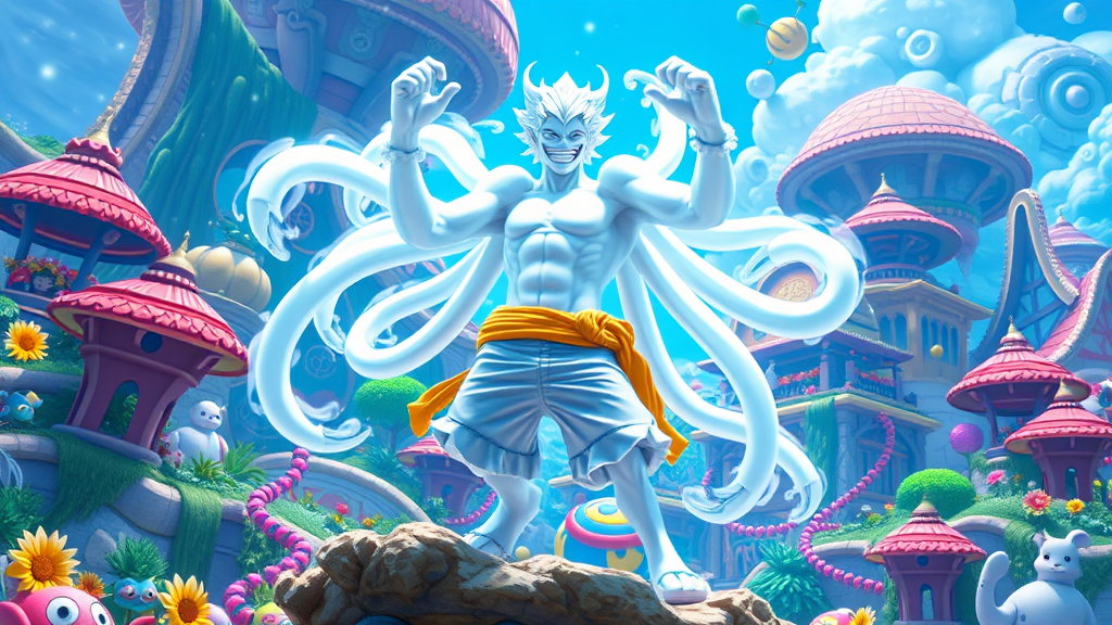 In a vibrant and whimsical world teeming with fantastical landscapes, Luffy from One Piece, in his legendary Gear 5 transformation as the mythical God Nika, takes center stage. His pristine white form gleams brilliantly against the colorful, lively backdrop, reflecting the essence of joy and adventure. Luffy's exaggerated rubbery features are on full display, animated with a playful touch that highlights his extraordinary elasticity. Each stretch and bend of his form is depicted with cutting-edge rendering technology, capturing every detail with remarkable artistry. His limbs whirl and twist in a comedic dance that fills the scene with laughter, as the exaggerated motion challenges the very boundaries of his rubbery nature. The environment buzzes with kinetic energy, echoing Luffy's exuberance and the enchanting rhythm of his movements, creating a breathtaking spectacle that merges hilarity with awe-inspiring wonder.