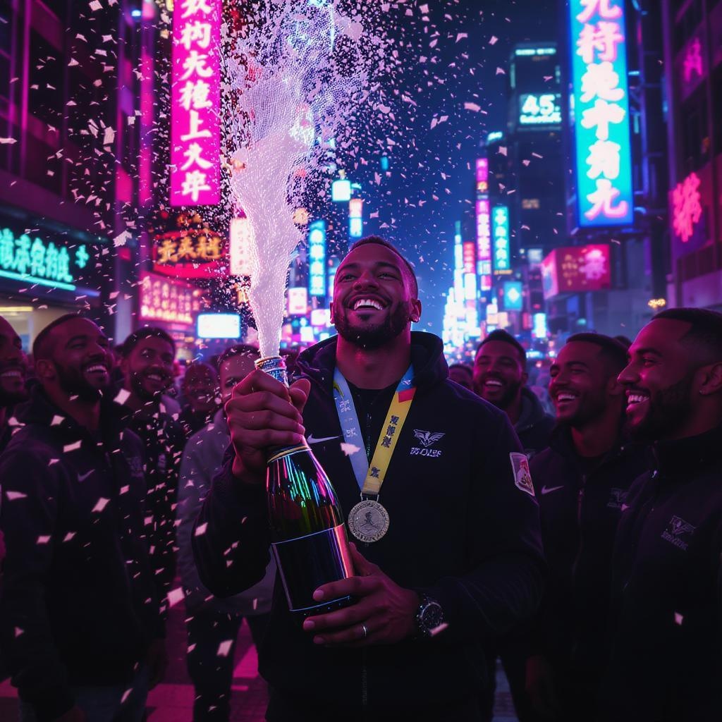 In a vibrant cyberpunk cityscape, neon lights reflect off towering skyscrapers as the victorious athlete, wearing a shimmering, high-tech medal, stands surrounded by a circle of jubilant friends and teammates. In his hands, he triumphantly holds a sleek, futuristic bottle of champagne. Iridescent champagne foam bursts forth in dazzling arcs, catching the glow of electric colors that dance through the air. Everyone around him is illuminated with expressions of joy and camaraderie, their eyes reflecting the kaleidoscope of hues from holographic billboards above. The camera captures the scene from the front and slightly above, framing the exhilaration of triumphant celebration amidst the urban neon glow.