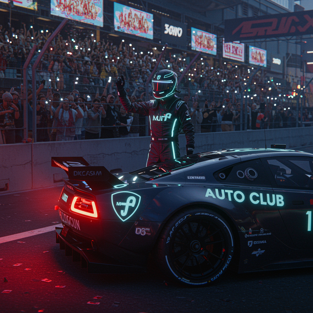 In a vibrant cyberpunk summer, the race track comes alive with neon lights dancing off a sleek car adorned with a luminous auto club emblem. Adjacent to the vehicle, a racing driver finalizes the fit of his high-tech helmet with one hand, the other arm raised in a triumphant wave to the throngs of fans. The driver’s cockpit remains mysterious, devoid of a traditional human presence, as if controlled by an advanced AI. Enthusiastic spectators fill the stands and line the track fence, their excited faces glowing in a sea of digital billboards. The camera captures the scene from a dynamic angle, slightly elevated and frontal, emphasizing the fusion of man and machine in this futuristic motorsport spectacle.