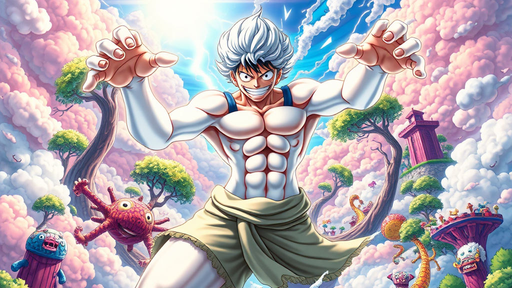 In a vibrant, fantastical world teeming with swirling clouds of brilliant colors and gravity-defying islands, Luffy from One Piece unleashes his Gear 5 transformation as the legendary God Nika. His pristine white form glows with an ethereal luminescence, while his exaggerated rubbery features stretch with an astonishing elasticity that defies physics. His body twists and contorts in comedic, yet awe-inspiring poses amidst a background of whimsical, cartoon-like creatures and landscapes that enhance the hilarity of the scene. Trees bend to his will, and the sky crackles with electric energy, as Luffy's wide-eyed expression and cheeky grin illuminate his face. His limbs extend in impossible directions, creating a harmonious blend of chaos and artistry. The cutting-edge rendering captures every nuance of his transformation, with highlights and shadows that accentuate his gleaming, elastic form. Small creative variations like mischievous, sentient clouds and dancing light beams add to the spectacle, enriching the tableau with lighthearted humor and unparalleled marvel.