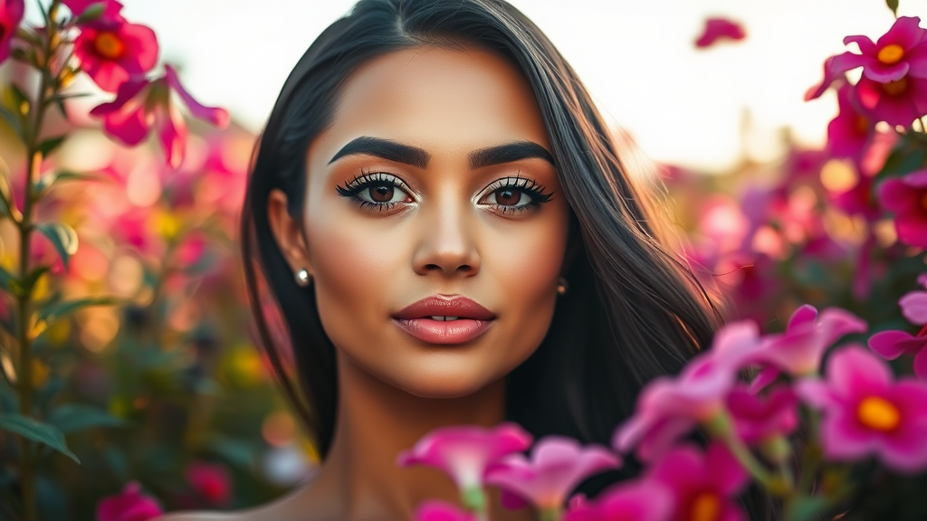 In a vibrant flower garden, a subject poses gracefully amidst the blooms, bathed in the gentle light of the morning sky. The photograph captures them with razor-sharp focus against a softly blurred bokeh background. Their skin is exquisitely detailed and radiant, accentuating their strikingly beautiful face. Their eyes are clear, with intricate detailing in the pupils, enhanced by a subtle application of lip gloss and a soft blush that highlights their cheeks. They wear small, elegant earrings that add a touch of sophistication to the overall composition. The image conveys a sense of serene beauty and professional artistry, embodying the essence of high-quality photography with meticulous attention to detail.