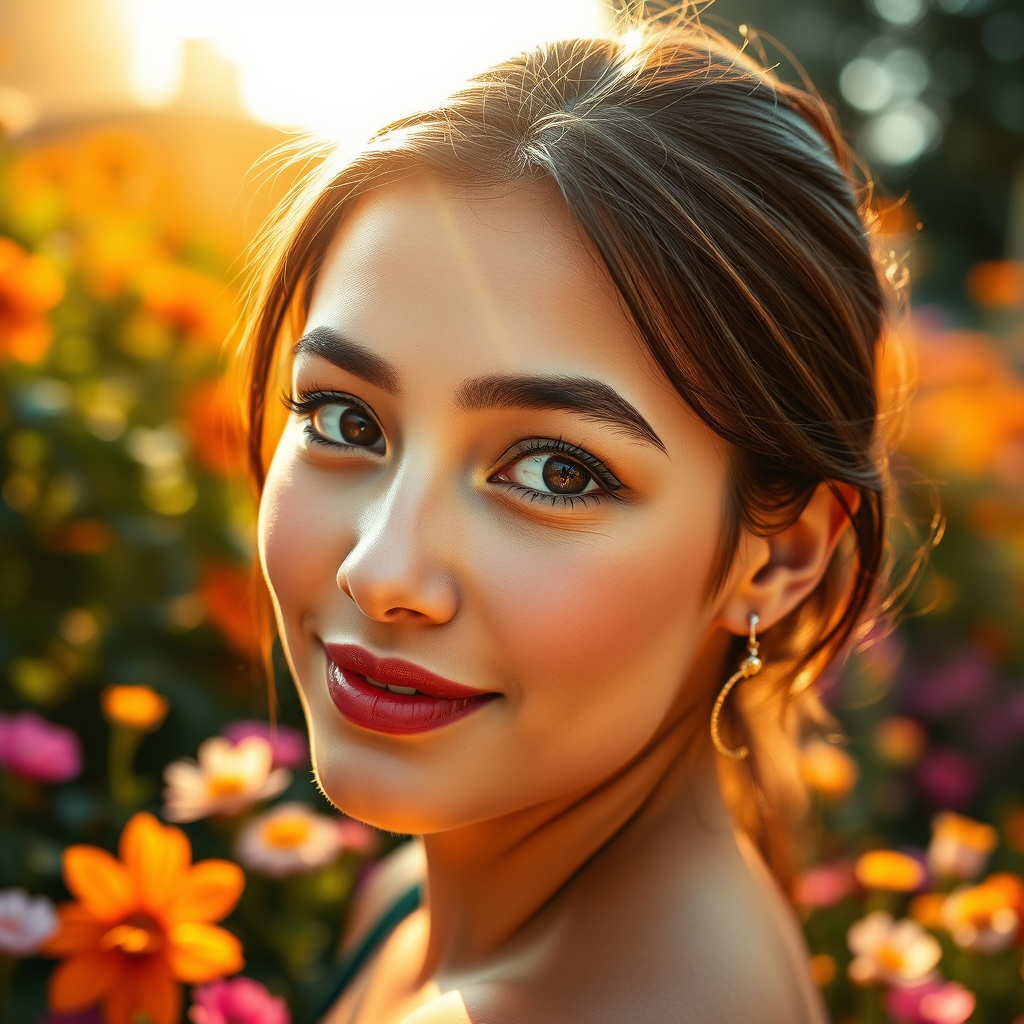 In a vibrant flower garden under the morning sky, a person poses gracefully for a professional photoshoot. The scene is captured in exquisite high resolution, highlighting the contrast between the detailed subject and the beautifully blurred bokeh background. The focus is sharp and precise, bringing forth the intricate details of their glowing skin and captivating features. Their eyes are clear and expressive, with the detailed pupils serving as the centerpiece of their gaze. Subtle lip gloss accents their smile, and a hint of blush on their cheeks adds to the overall elegance. Small, delicately crafted earrings serve as a subtle accessory, perfectly complementing the refined look. The atmosphere is rich in detail and color, offering a sense of calm and serenity amidst the lively blooms.