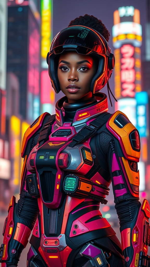 In a vibrant, futuristic Neo-Tokyo cityscape illuminated by an array of neon lights, stands a strikingly confident black woman in her 30s, clad in sleek, high-tech cyberpunk afrofuturism armor. This multicolored armor envelops her from head to toe, featuring intricate designs and numerous advanced gadgets subtly glowing against the night backdrop. Her face is partially obscured by a sophisticated helmet with a tinted visor, hinting at the intensity in her gaze and readiness for action. The luminous neon skyline complements the armor’s hues, crafting an extraordinary, visually captivating scene. Directed by Ridley Scott, the image evokes the futuristic essence of films like Starship Troopers and Dredd, skillfully blending elements of cyberpunk and afrofuturism to present a unique and enthralling cinematic moment.