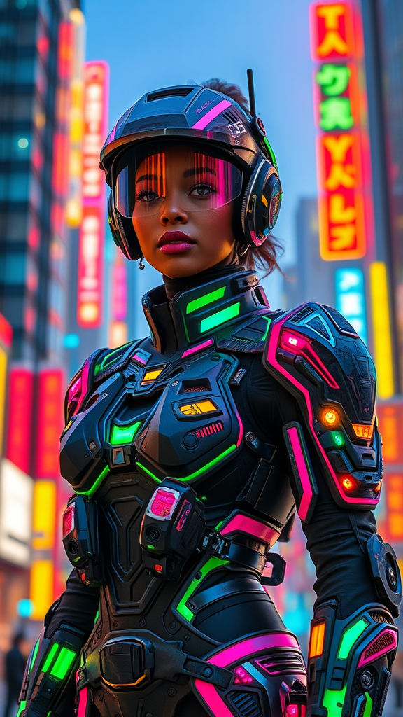 In a vibrant, futuristic Neo-Tokyo, the cityscape pulses with life as neon lights cast a colorful glow over towering skyscrapers. Amidst this electrifying scene stands an alluring woman in her 30s, her presence commanding and confident. She wears an elaborate, multicolored cyberpunk afrofuturism armor, seamlessly blending advanced technology with striking aesthetics. The armor, sleek and fitted, is adorned with an array of high-tech gadgets, demonstrating both functionality and style. Her face is partially concealed by an advanced helmet featuring a tinted visor, subtly hinting at the intensity of her readiness for action. The armor's glowing hues enhance its intricate patterns, harmonizing with the neon-lit ambiance of the city. This vision, directed by Ridley Scott, draws inspiration from the speculative futures of Starship Troopers and Dredd, merging cyberpunk and afrofuturism elements to craft a uniquely stunning and imaginative world.