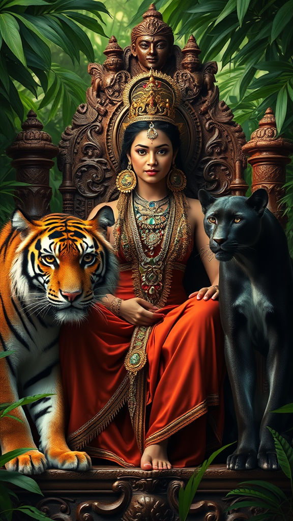 In a vibrant jungle setting, a stunning π goddess sits regally on a carved wooden throne surrounded by lush greenery. Her detailed face radiates beauty and wisdom, capturing the essence of an ethereal being. Flanking her are a majestic tiger with striking stripes and a sleek, mysterious panther, their eyes glinting with intelligence. The scene is bathed in cinematic light, casting dramatic shadows and highlights that enhance the rich colors of the jungle. This character portrait, reminiscent of the work of Annie Leibovitz, is expertly retouched with the precision of Pratik Naik, bringing every detail to life with exquisite clarity and depth.