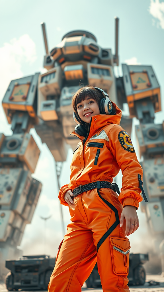 In a vibrant movie poster setting, a young female DJ stands confidently in a futuristic, intricately designed orange jumpsuit, poised with headphones in hand. The atmosphere is alive with the essence of music and sound swirling around her. In the background, a towering old Mech looms, framed by a clear, sunny sky. The scene is infused with anime and manga artistic influences, showcasing bright, bold colors and detailed, offset printing in an 8K, HD, and CMYK finish. The DJ exudes a sense of joy and energy, illuminated by natural lighting, capturing the dynamic spirit of the moment.