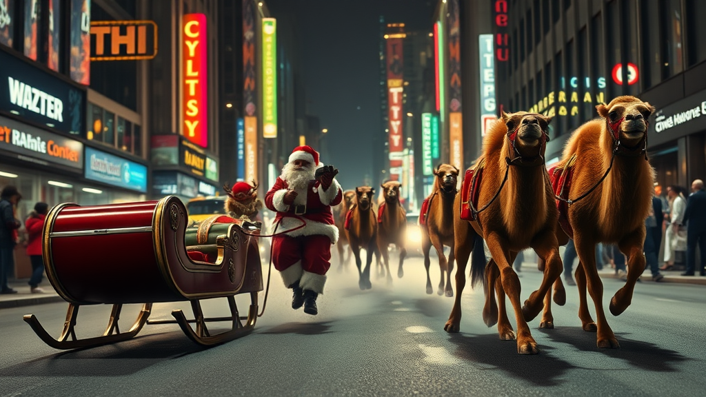 In a vibrant night scene, Santa Claus and The 3 Wise Men gear up for a thrilling race down a bustling urban street. The camera zooms in on Santa’s sleigh, sleek and polished, with reindeer snorting eagerly, then cuts to the Wise Men's camels, their hooves stamping with anticipation. As the race kicks off, a wide shot captures the energy of both teams as they speed forward, leaving billowing clouds of smoke. The sleigh glides smoothly on an ethereal path while the camels gallop with elegant strength, both creating dazzling reflections in the neon-lit cityscape. The camera seamlessly tracks their movement, maintaining a rapid pace that mirrors the exhilaration of the race, blending detailed close-ups with sweeping wide shots to immerse viewers in the heart of this magical urban chase.