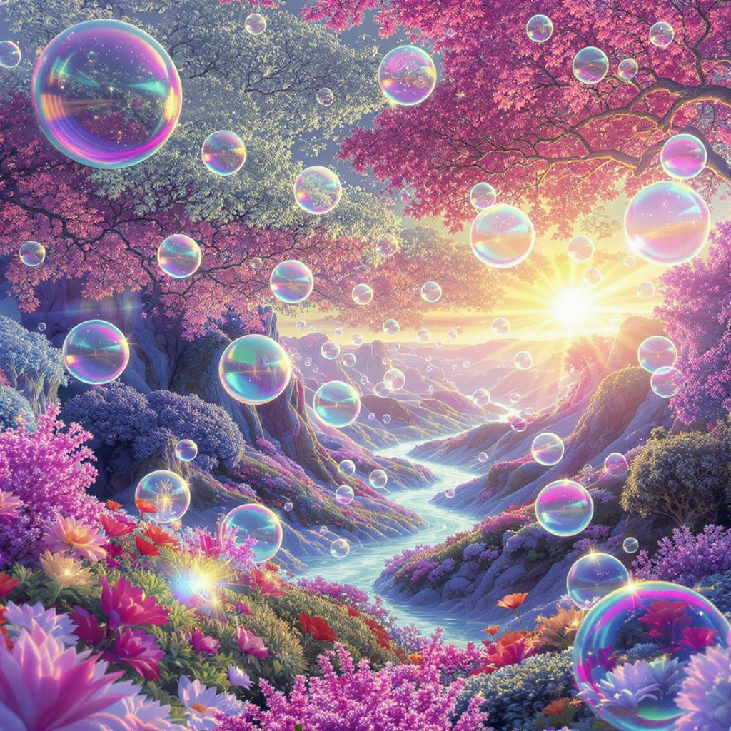In a vibrant realm where colors pulse with life, Bubbleworld emerges as an enchanting landscape, its spherical entities floating amid a kaleidoscope sky. Each bubble is a universe, reflecting chromatic wonders and hues that sing in harmony. The air hums with the whisper of iridescent breezes, and prismatic flora glimmer like gems under a spectrum-lit sun. Here, the boundaries of imagination bend, and the very essence of color weaves through the ethereal tapestry of this mesmerizing domain.