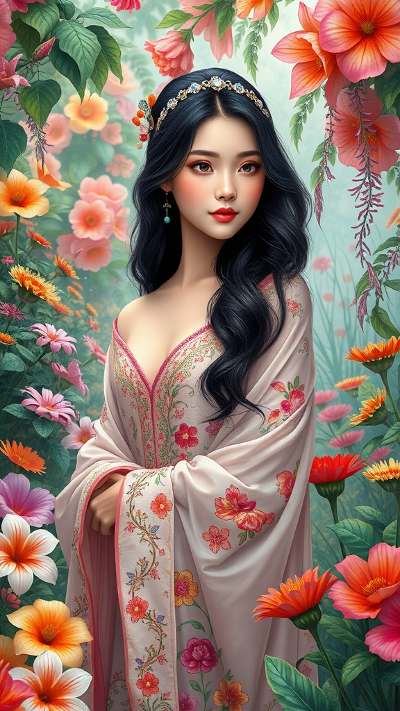 In a vivid, hypermaximalist artwork, a young Asian woman stands gracefully amidst a vibrant garden teeming with a riot of flowers and rare, lush plants. Her skin emits a gentle, inner glow, complementing her cascading dark hair that flows in soft waves. Dressed in a flowing gown adorned with intricate, colorful embroidery, she wears a delicate headband decorated with shimmering jewels. The atmosphere is one of serene beauty and exuberant life, with every element carefully balanced to create a harmonious scene.