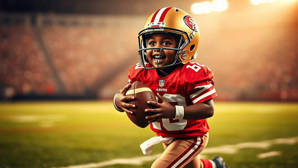 In a vivid scene, an African American toddler dressed in a full San Francisco 49ers uniform, complete with a red and gold jersey and helmet, is captured mid-action on the football field. The young player, beaming with joy, is sprinting with the football nestled securely in his arms, just moments away from scoring a triumphant touchdown. The atmosphere is electric with excitement, highlighted by dramatic lighting that emphasizes the toddler’s enthusiastic expression and dynamic pose. The hyper-realistic image is professionally shot with meticulous detail, reminiscent of a Canon EOS-1D X Mark III photograph, celebrating a moment of pure victory and exuberance.