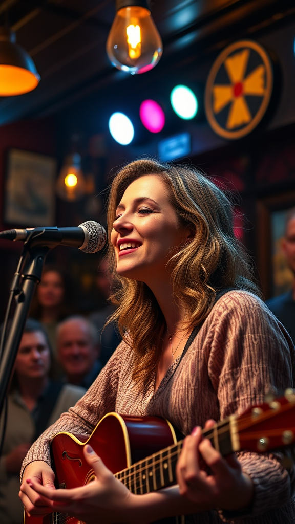 In a warmly lit, intimate pub, an enchanting female singer-songwriter takes center stage, her soulful voice resonating through heartfelt ballads that captivate the audience. Captured in stunning 8K resolution with a Canon EOS 5D Mark IV, the image boasts fine-art quality, showcasing sharp details and significant textile textures. The scene is beautifully illuminated with cinematic lighting, offering a hyper-detailed, hyper-maximalist view. The photography is award-winning, with a clean, sharp focus and crystal clear feel that evokes the allure of magazine and advertising photography. The image is high quality, HD, with perfect shading, portraying a vibrant atmosphere and the expressive nuances of the performer.