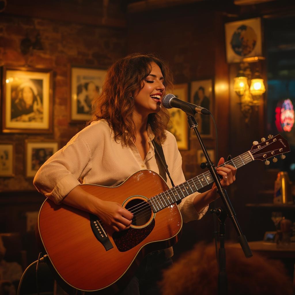 In a warmly lit pub, a gifted female singer-songwriter takes center stage, channeling her emotions into stirring ballads that captivate the audience with her rich and soulful voice. Captured with a Canon EOS 5D Mark IV, this 8K RAW image showcases high resolution and award-winning photography with sharp, beautiful details. The scene is infused with cinematic lighting, and the hyper-detailed, hyper-maximalist approach brings out significant textile textures, resulting in a clean, sharp, and crystal-clear photograph. This fine-art print exemplifies magazine and advertising quality, with perfect shading and high definition in mind, presenting a striking composition that leaves a lasting impression.
