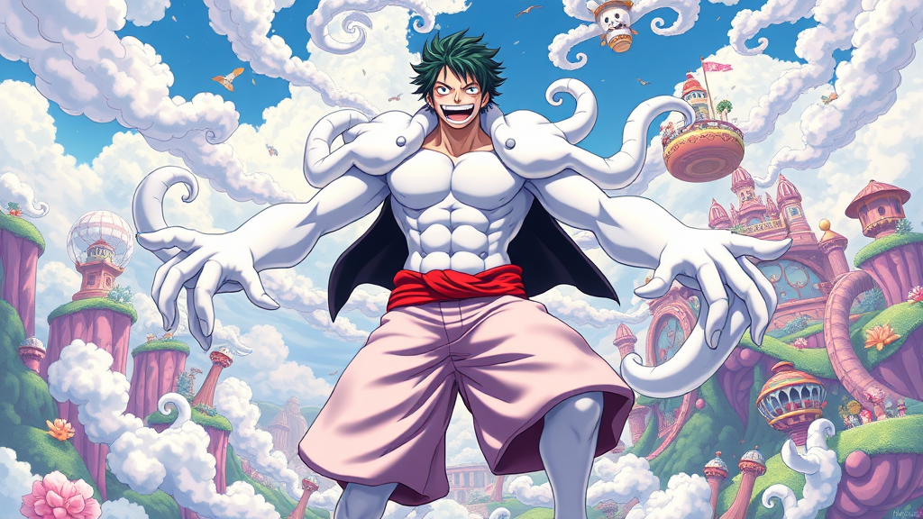 In a whimsical and lively realm filled with vibrant colors and bizarre landscapes, Luffy from One Piece takes center stage in his legendary Gear 5 transformation as God Nika. His pristine white form stands out, with extraordinary exaggerations of his rubbery features, capturing the humor of his iconic elasticity. With clouds spiraling around him like mischievous spirits, Luffy's stretched limbs twist and loop in comedic delight, forming fantastical shapes that defy logic and gravity. His eyes twinkle with mischief, blending seamlessly into the spirited environment of bouncing terrain and animated flora. Bursting with energy, laughter rings in the air, harmonizing with the surreal backdrop as floating islands dance in the sky, their bright hues reflecting the joy and freedom of Luffy's unparalleled power. The illustration emphasizes cutting-edge rendering techniques, weaving art and comedy into a side-splitting masterpiece that celebrates the playful essence of Luffy's newest transformation.