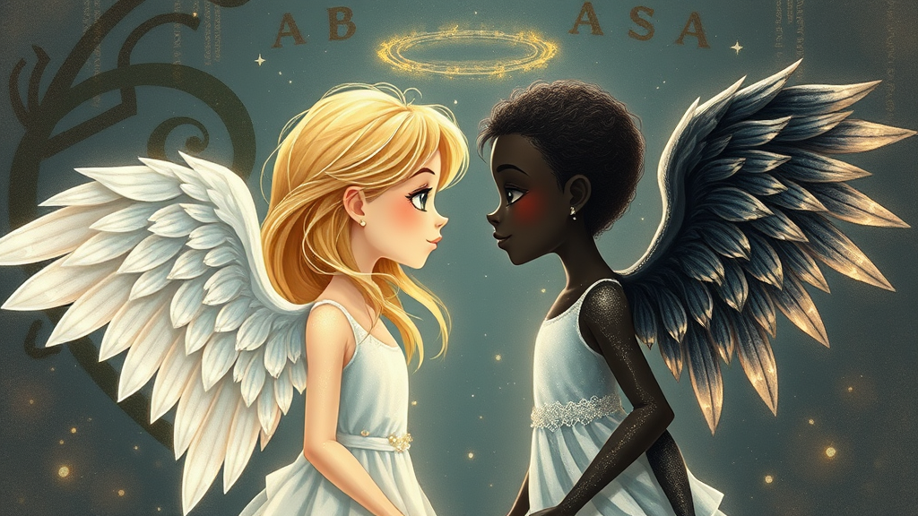 In a whimsical and surreal illustration, two ethereal angels stand face to face. One is a stunning blonde Caucasian angel, her shimmering white wings reflecting light, while the other, equally mesmerizing, is a radiant black angel with gleaming black wings. Both are depicted in intricate detail, capturing their unique elegance and beauty. Despite the 2D representation, there's an enchanting depth to their presence, as they exhibit their celestial aura, meeting in a moment that suggests unity and contrast. Unintenionally paired with text artifacts and abstract anomalies, the creation carries an air of mystery, blending otherworldly charm with subtly skewed realities. The focus remains on the angels' captivating interaction, set against the gentle chaos of unintended artistic imperfections.