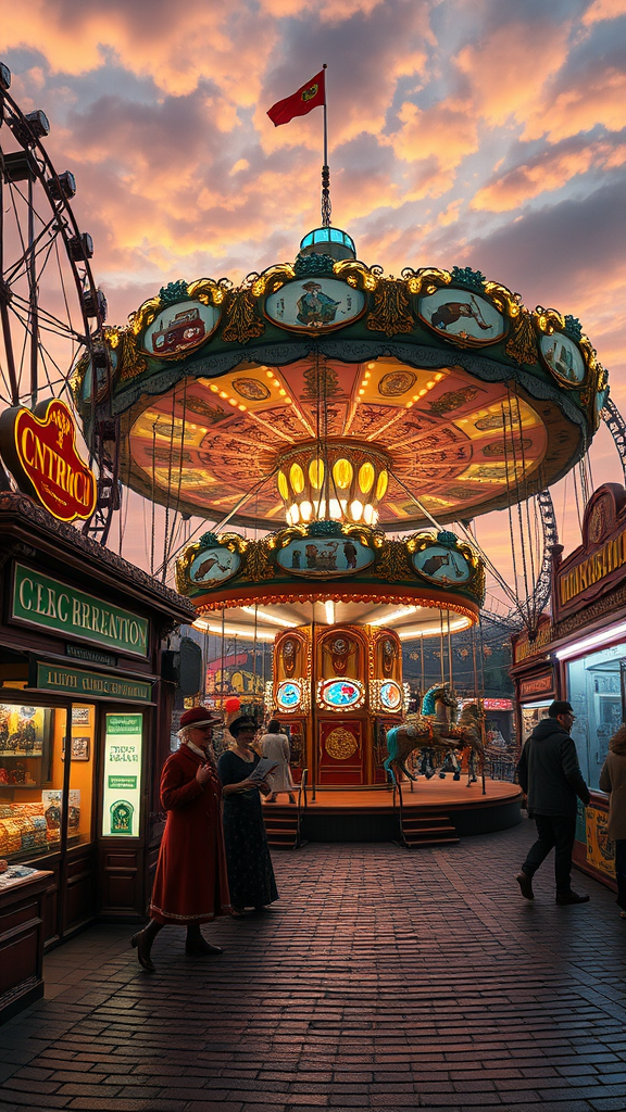 In a whimsical commentary on consumer culture, envision a Victorian-era carnival, reimagined through a modern lens, where steam-powered Ferris wheels spin with encapsulated storefronts of popular fast-food chains. The cobblestone paths are lined with vendors in steampunk attire, offering mechanical treats like clockwork popcorn and soda served in brass contraptions. In the center, a grand carousel is adorned with hand-carved replicas of contemporary gadgets, and riders don virtual reality masks that transform their perception of this anachronistic amusement park. The sky is an imaginative blend of golden dusk and neon hues, casting a surreal glow over the scene, inspired by Tim Burton's whimsical darkness and Hayao Miyazaki's dreamlike storytelling.