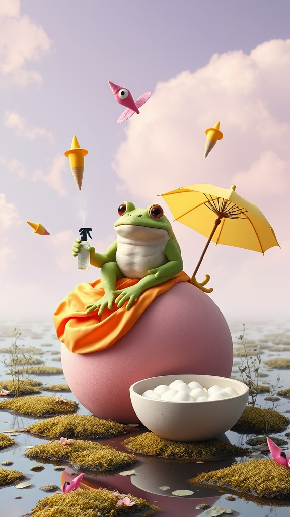 In a whimsical, dreamlike setting, a large, green, anthropomorphic frog with a serene expression sits atop a pink sphere draped in an orange silk fabric. The frog casually holds a sunny yellow umbrella in one hand and a tiny, misty spray bottle in the other. Around the frog, a collection of floating abstract forms, including pink and yellow cone-like shapes, drift gently. Nearby, a ceramic bowl brimming with soft, cloud-like substance adds an element of curiosity. The sky glows with pastel hues of soft lavender and sky blue clouds, casting a gentle light over the scene. The ground, lush and swampy, is adorned with patches of floating moss and delicate plants, completing the surreal landscape with a playful, fantastical ambiance.