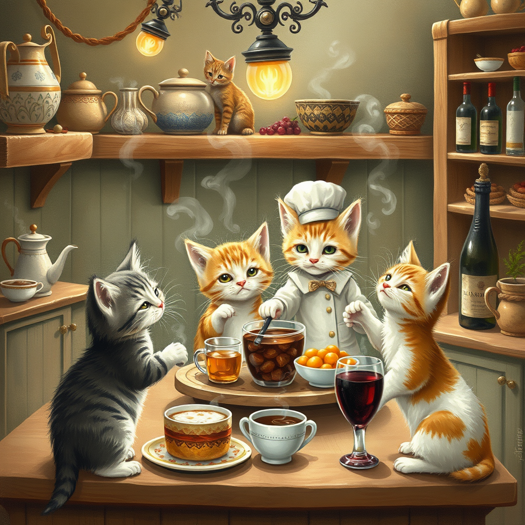 In a whimsical world, kittens bustle about like tiny chefs, preparing steaming pots of tea, brewing aromatic coffee, and concocting rich hot chocolate. With charming dexterity, they dart to and from the kitchen, fetching delightful meals, and scamper down to the cellar, selecting exquisite wines to accompany the feasts.