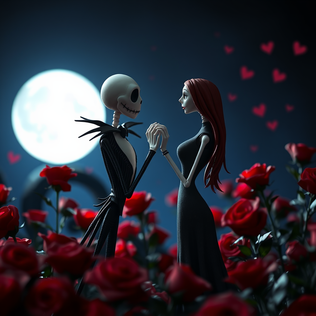 In a whimsical world where the macabre meets romance, Jack Skellington and Sally stand together under a night sky, a luminous full moon casting an ethereal glow over them. Their skeletal arms entwine amidst a garden of vibrant red roses and floating hearts, as they share a tender moment of affection. The scene is set in the unique style of Tim Burton, with eerie charm and darkly elegant stop motion animation. The depth of field focuses on Jack and Sally's intertwined hands, with the cinematic composition capturing the intricate details of their love amidst a backdrop of shadows and moonlight.