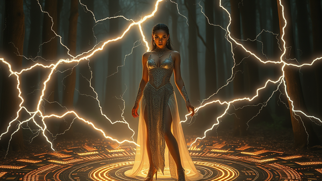 In a whirlwind of spiral lightning, a resplendent young woman with an exquisitely beautiful face stands poised on a ground that resembles a circuit board, garbed in intricately designed attire. Her stance is one of elegance and power, set against a moody, epic woodland backdrop. The scene is a hyper-maximalist cinematic portrayal of dark fantasy, capturing every detail with ultra-realistic, 8k resolution quality. Her expression is a captivating blend of an evil smile and wild eyes. Every part of her is meticulously crafted—perfect hands, eyes, and lips—standing out in a photorealistic composition reminiscent of a 3D Octane Render. This detailed concept art offers a sharp focus and flawless composition, ideal as high-definition, HDR wallpaper.