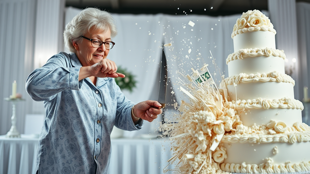 In a wide-angle shot, a determined grandmother in pajamas, wearing glasses, wields a large knife to slice through an elaborate multi-tiered wedding cake. The lighting is bright and white, focusing on the dramatic scene. Her hands grip the knife with intensity, and her face is a mix of force and unresolved emotion. Suddenly, the cake erupts into a frenzy of crumbs and disarray, mirroring her inner frustrations. The background features a pristine, white-themed wedding catering setup, enhancing the contrast of the exploding cake.