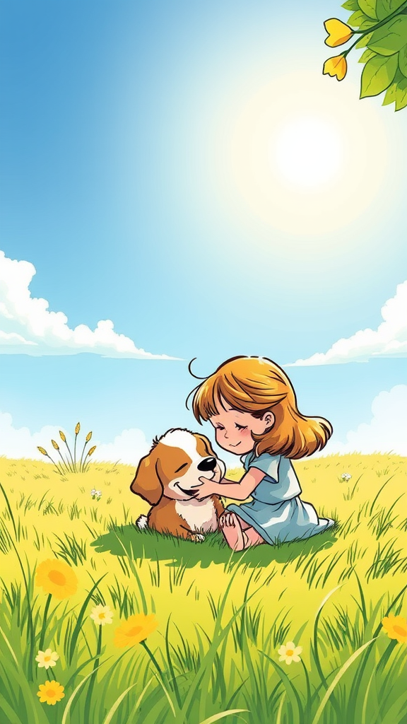 In a wide-open meadow under a bright blue sky fringed with lush green foliage, a playful puppy nestles contently in the gentle embrace of a young girl, both delighting in the golden warmth of the spring sun. The scene is depicted in a charming, comic style reminiscent of Charles M. Schulz, capturing the innocence and joy of the moment.