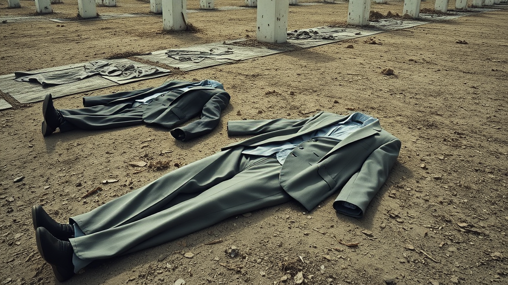 In a world devoid of life, only the hollow shells of suits remain, lying flat and horizontal on the ground, a silent testament to the absent humanity they once adorned.