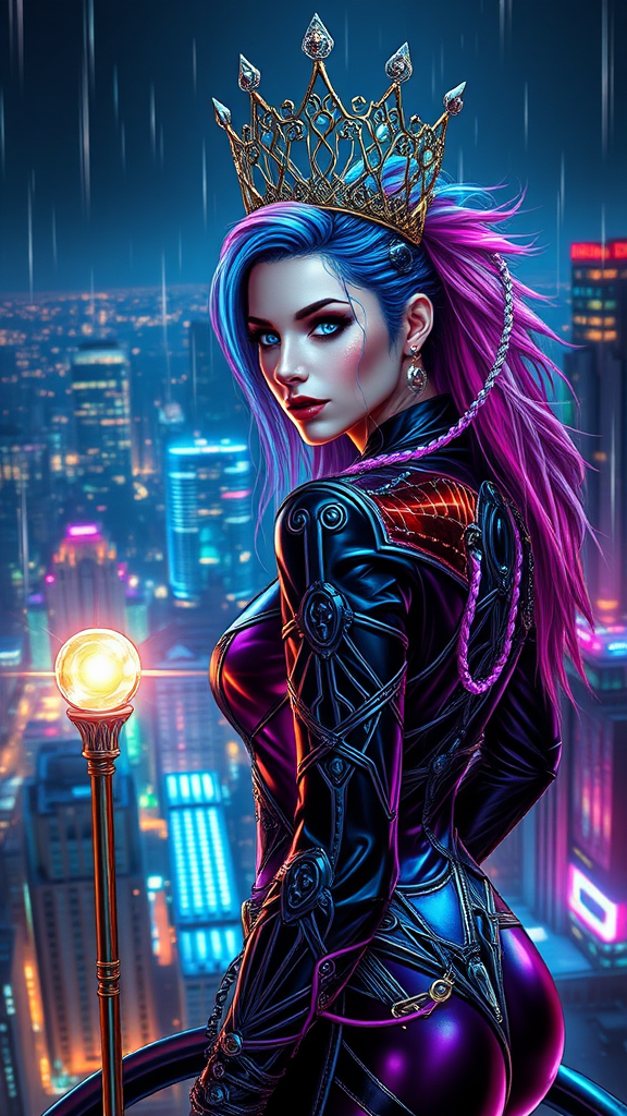 In a world of vibrant technology and endless night, the Cyberpunk Fantasy Queen reigns supreme from her luminescent throne of neon lights. She gazes out over a sprawling cityscape of towering skyscrapers and flickering holograms, her piercing blue eyes intensified by intricate cybernetic enhancements. Her hair, a dynamic spectrum of shifting colors, reflects the pulsating glow of the urban jungle. Clad in a sleek, black suit interwoven with gleaming metal and intricate circuitry, she exudes an aura of elegance and power. In her grasp, a radiant scepter symbolizes her undeniable authority. Feared and revered in equal measure, she rules this dazzling realm with unyielding command.