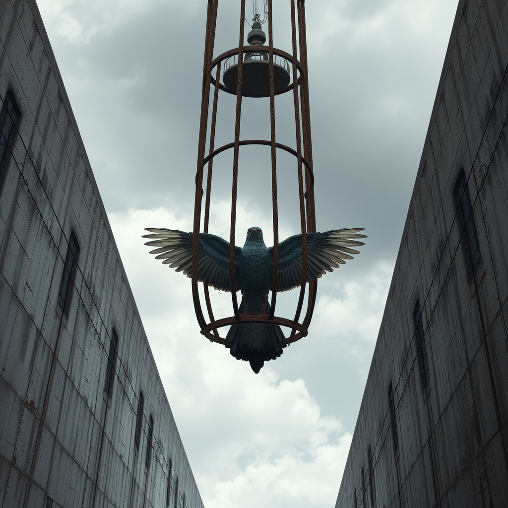 In a world overshadowed by towering gray walls, she is like a nightingale trapped within an iron prison, wings yearning for the freedom of open skies, yet confined to a barren reality where the only song is that of rusted metal groaning against an oppressive sky.