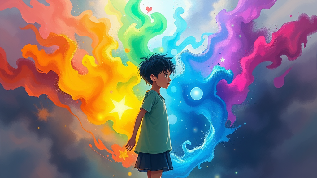 In a world where emotions manifest as tangible colors, a young artist discovers their ability to manipulate these vibrant energies, embarking on a journey to unravel the mysteries behind human feelings and to restore emotional harmony to a divided society.