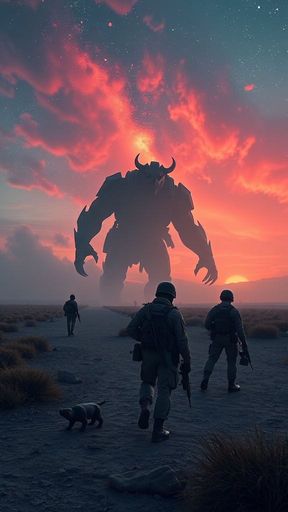 In a world where soldiers are rigorously trained in virtual reality environments designed for ultimate realism and efficiency, they navigate intricate landscapes that seamlessly blend science fiction with fairy tale fantasy. The immersive experience turns nightmarish when a malicious virus infiltrates the software, trapping soldiers in these simulated realms. Devoid of safety protocols, digital threats start to manifest with terrifying authenticity. Among these, a cursed prince morphs into a fearsome beast, stalking through a landscape that shifts from Nielsen D3500 DSLR-captured delicate nebulae to the stark simplicity of plains, echoing the atmospheric photography style of Robert Capa and Alfred Stieglitz. Soldiers find themselves stationed at a Future Circular Collider, interpreting the world through thermal vision under a sky teeming with vibrant, multi-colored backgrounds. Surrounded by a mystifying and beautiful island lagoon, the environment swings between enchanting fairy tale vistas and cold sci-fi scenarios, enhanced by photorealistic and hyperrealistic Hasselblad X1D detail. The cinematic atmosphere, akin to the mood in 'Pursuit' by Gesaffelstein, offers natural textures and vivid lighting that surge with an action-packed, movie-style flair. Soldiers battle against these hyper-realistic foes in epic scenes, captured with volumetric, moody lighting that shapes their dynamic action poses into a blurred, yet finely detailed 8K Ultra-HD panorama. Each RAW photo depicts a world rife with natural light, soft overcast skies, and a luminous vibrancy that underscores the profound sense of being truly alive within these digital confines. The battle continues, a hyper-detailed saga framed by cinematic rendering and ray-traced reality in each 8k UHD capture, as these soldiers strive for survival in a universe where the line between real and virtual has irrevocably blurred.