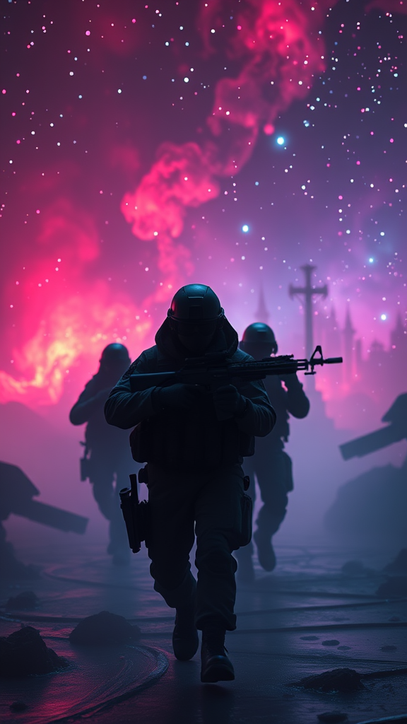 In a world where soldiers are trained in cutting-edge virtual reality environments, a group becomes ensnared when a malicious virus infects the system, transforming simulated challenges into actual threats. Trapped in this digital maze, the line between reality and simulation blurs as imagined foes take on a life of their own. A cursed prince, turned into a beast, prowls as an ominous shadow amid a galaxy-tinted nebula. The soldiers, armed with their instincts and Nikon D3500 DSLR cameras, navigate their eerie surroundings: a confluence of beautiful island lagoons and fairy tale landscapes juxtaposed with the plain, stark outlines of the Future Circular Collider. Echoes of Robert Capa's eye for realism mingle with Alfred Stieglitz’s avant-garde compositions as they struggle to escape. With thermal vision, the vibrant hues of multiple backgrounds illuminate their path. Photographic dynamics shift from Hasselblad X1D marvels to the raw grit of var-cinematic-fx, all captured with ultra-HD precision. Battling against the odds, they confront a spectacle of futuristic abstraction and hyper-realistic textures, highlighted by moody and cinematic lighting. The action unfolds with natural blur and an epic display of volumetric lighting and motion, reminiscent of 'Pursuit' by Gesaffelstein. Each detail is meticulously rendered in crisp 8K, with a blend of natural light and refined photographic style, the ultimate testament to human resilience and adaptability in the face of an artificial reality turned perilously real.