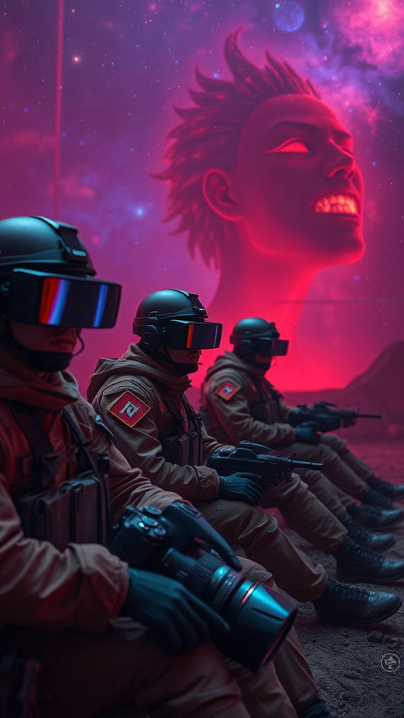 In a world where soldiers are trained in virtual reality environments for unparalleled experience and efficiency, a sinister turn of events unfolds. A planted virus traps them inside these simulations, turning what was once a perfectly safe training ground into a terrifying battlefield where simulated threats become dangerously real. Amidst this chaos, a cursed prince transformed into a beast, a Nikon D3500 DSLR camera lying abandoned, and a mystifying nebula acting as a backdrop add to the surreal mix. The soldiers, sitting with masks obscuring their facial expressions, must navigate through enchanting scenes juxtaposed with high-tech landscapes like the Future Circular Collider. Their thermal vision reveals backgrounds painted in multiple colors—from a beautiful island lagoon to a fairy tale fantasy land, reminiscent of Alfred Stieglitz's work mingled with modern science fiction themes. Captured in Hasselblad X1D - 50c, the scene exudes a photorealistic hyperrealism with cinematic blur effects and long exposure shots in 8K Ultra-HD. Natural, moody bright lighting and vibrant details set an atmosphere that's both epic and action-packed. The photos, taken with a DSLR, boast raw, ultra-detailed quality, weaving natural textures, lighting, and dynamic compositions in a style inspired by 'Pursuit' by Gesaffelstein. The soldiers, depicted in dramatic action poses, traverse a landscape marked by ray tracing and the finest cinematic rendering, where every frame conveys the urgency and depth of a social science fiction saga.