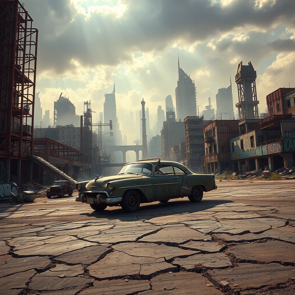In a world where the remnants of civilization cling to survival, a sprawling cityscape stands as a testament to a bygone era—a chaotic tapestry of rusted metal and twisted architecture, the skyline pierced by jagged, skeletal structures. Amidst the rubble, a lone car, battered and misshapen, idles on a cracked, desolate street, its engine sputtering in protest. The air is thick with dust and the faint echoes of forgotten voices, casting a somber hue over the landscape. Yet, amidst the gloom, there are pockets of surprising vibrance—a graffiti-covered wall bursting with color, wildflowers stubbornly sprouting between slabs of concrete, and beams of sunlight that break through the clouds, offering a rare moment of cheer in a world painted in shades of gray. The city, though ugly and deformed, tells stories of resilience and echoes of hope in its vibrant, if unlikely, beauty.
