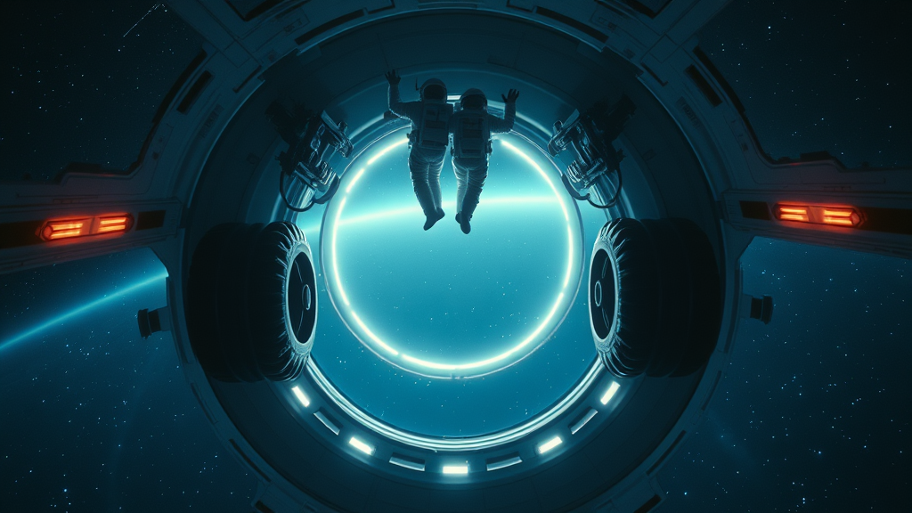 In an 80s-inspired cinematic view from above, two astronauts gracefully drift in the weightlessness of space. Below them, an open circular hatch glows softly, encircled by imposing black wheels and delicate lights, hinting at advanced technology. The vast, starry expanse of the night sky stretches endlessly in the background, evoking the futuristic and minimalist style reminiscent of John Berkey. The scene captures a sense of serene exploration and the boundless mystery of outer space.