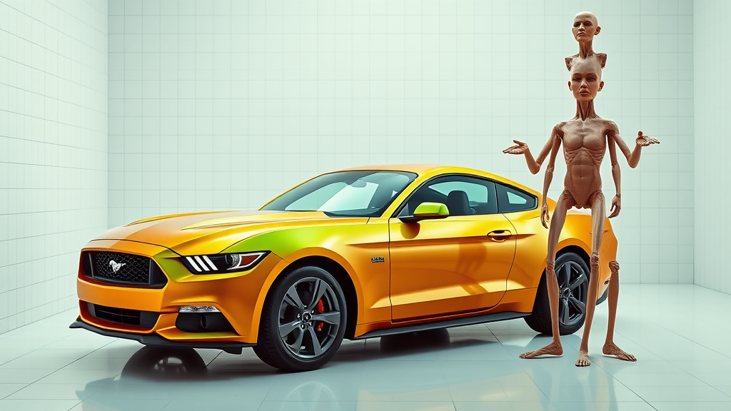 In an all-white tiled room, a metallic green Ford Mustang gleams under bright lighting, its surface reflecting a perfect orange hue. The scene boasts an array of pastel colors, captured in ultra-realistic 8k detail with professional color grading akin to commercial photography. Amidst this setting, an abstract totem pole composed of stacked, disproportionate torsos with bizarre anatomy displays extra and missing limbs. Floating and disconnected limbs create a surreal, mutated art piece, with elements that blur the lines between beauty and distortion, capturing an unsettling yet fascinating tableau.