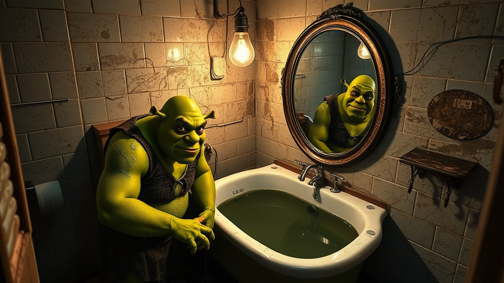 In an ancient, filthy bathroom of an abandoned house, Shrek, covered in slime with bloodshot eyes, crouches beside a bathtub filled with stagnant water. The cracked tiles and mold-stained walls add to the decay, while a flickering light bulb casts an eerie glow over the scene. The reflections of both figures in the mirror appear warped and distorted, heightening the chilling atmosphere and evoking a sense of horror.