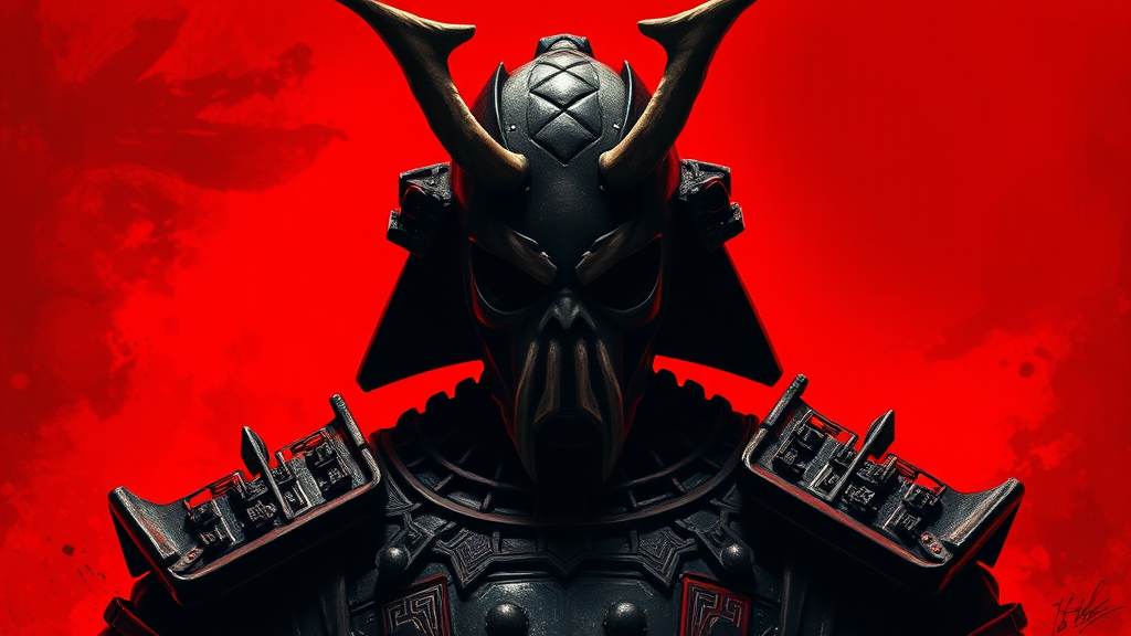 In an atmosphere filled with tension and mystery, a formidable figure looms against a vivid crimson backdrop. Partially obscured by shadows, this enigmatic presence dons armor reminiscent of samurai attire, with intricately segmented plates adorning the shoulders and upper arms. Its most striking feature is a grotesque mask, adorned with small, twisted horns. The mask's hollow eye sockets create an ominous, otherworldly visage. Rendered in deep shades of charcoal and obsidian, the armor and mask starkly contrast with the brilliant red background. This dynamic interplay is further accentuated by bold, expressive brushstrokes, particularly in the fiery backdrop. The intense lighting casts dramatic highlights and shadows, enhancing the figure's menacing aura. The composition focuses tightly on the upper torso, emphasizing the figure's commanding presence and enigmatic allure.