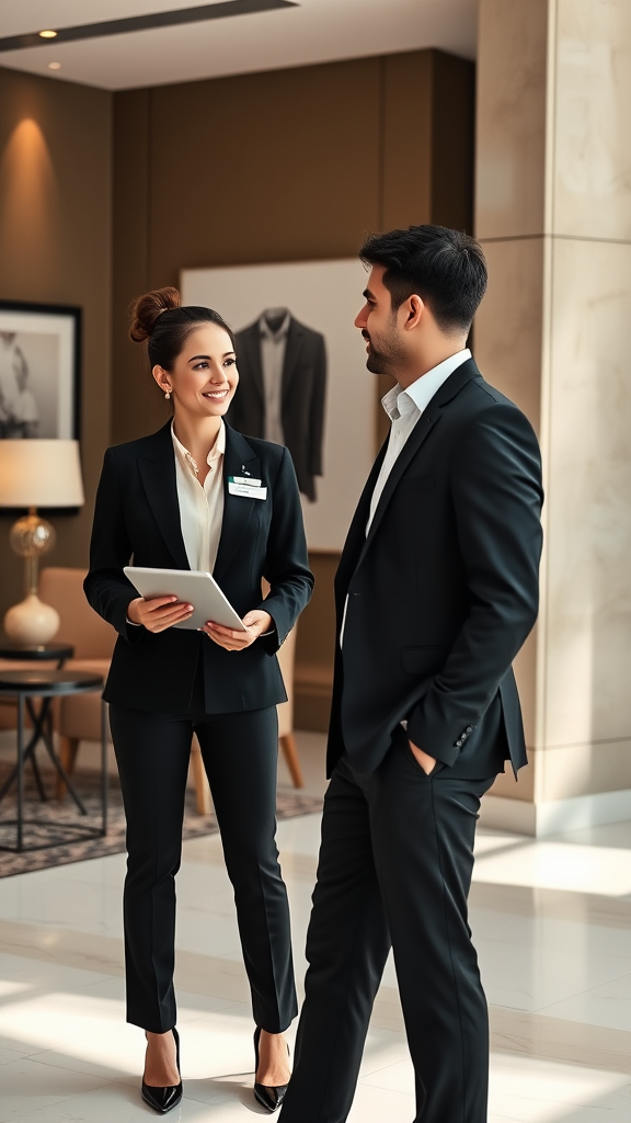 In an elegant, high-end business lobby, a female employee, dressed in a smart black blazer with a name badge and a soft cream blouse underneath, stands poised with her hair styled in a sleek bun. She holds a sleek tablet, its screen subtly glowing, as she engages with a male client, who appears in a sharp black suit and crisp white shirt. Both of them exude professionalism amidst the modern, upscale setting. Around them, contemporary art pieces and striking photographs add a touch of sophistication to the ambience. The lighting is understated yet enhances the luxurious feel, casting warm shadows across the neutral-toned decor. Her friendly, professional smile complements the refined aesthetics, while the man listens attentively, his side profile turned toward her, indicating an attentive engagement in their business interaction. The overall mood is one of class, precision, and polished professionalism, with the color palette harmoniously blending blacks, whites, and gentle neutrals, creating an effortlessly sophisticated environment.