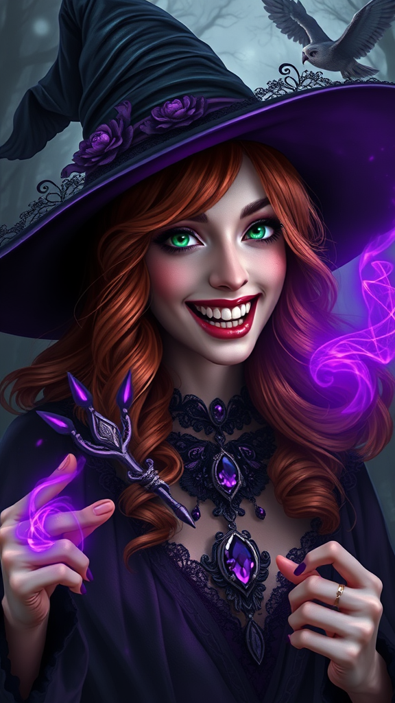 In an enchanting digital fantasy artwork, a captivating witch is portrayed with distinctive features. The subject is a woman with alabaster skin and fiery copper hair cascading in loose waves. Adorning her head is a traditional black witch's hat, paired with a shadowy, lace-edged cloak. Her eyes shine with an electrifying, luminous emerald hue, and her grin reveals sharp, elongated fangs. In her right hand, she wields a wand that emanates a swirling, violet magical glow. Draped around her neck is an elaborate, dark choker adorned with a gleaming, sapphire gemstone pendant. The backdrop is a murky, fog-laden forest with the haunting silhouettes of owls in flight, contributing to the mystical and eerie ambience. The overall color scheme is a rich blend of dark shades with vibrant purple accents, heightening the supernatural essence of the artwork.