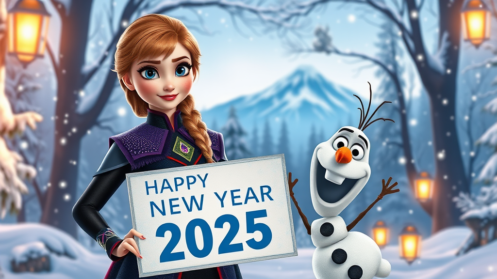 In an enchanting snowy landscape of Arendelle, Princess Anna stands confidently next to Olaf, both holding a sign that reads "Happy New Year 2025." Anna is depicted in a sophisticated and slightly daring version of her iconic outfit, crafted from high-shine materials with modern accents that highlight her confidence and charm. Her spirited and adventurous personality shines through her expressive eyes and lively demeanor. Her signature pigtails frame her face, with a few strands playfully catching the winter breeze. Behind them, the softly lit winter forest adds an ethereal glow, while shimmering snowflakes cascade gently around them. The warm glow of lanterns creates a magical ambiance, with a distant silhouette of the North Mountain peeking through the gentle snowfall, adding a subtle nod to the story. Olaf, in his usual cheerful disposition, mirrors the joyous energy of the scene.