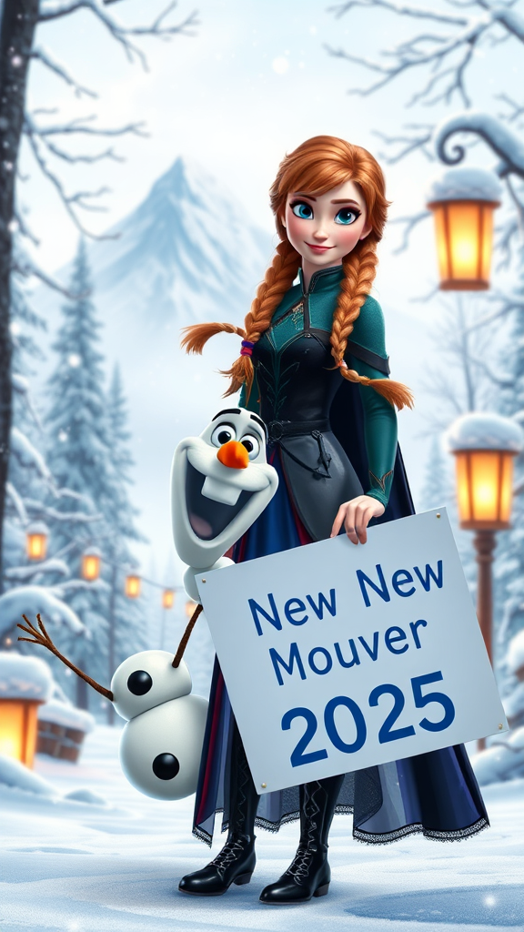 In an enchanting snowy landscape of Arendelle, Princess Anna and Olaf stand together, both vibrant and full of life. The backdrop is a softly lit winter forest with shimmering snowflakes gently falling and the warm glow of lanterns illuminating their surroundings. Anna, embodying her spirited and adventurous personality, wears a sophisticated and daring version of her iconic outfit. Her dress is high shine, with modern accents that enhance her confidence and charm. Her signature pigtails flow freely, capturing a playful yet bold essence. Beside her, Olaf, charming as ever, gleefully holds one side of a sign that reads "Happy New Year 2025." In the distance, the majestic North Mountain subtly rises, a nod to their unforgettable journey. Together, they create a scene of warmth, adventure, and celebration against the beautifully magical wintry backdrop.
