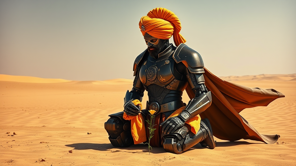 In an endless barren desert under natural daylight, an 1800s Sikh king kneels gracefully, wearing a magnificent turban paired with a Japanese-inspired mecha exoskeleton gundam suit reminiscent of Warhammer. The suit's sleek neo-futuristic carbon-fiber design is intricately engraved with golden Punjabi letters that imbue it with mystical powers. A long, heavy cape flows behind him, echoing the romance of historical grandeur and cutting-edge technology. His face is concealed by a finely crafted metal mask, showcasing his powerful chest at the heart of the image. This figure carefully picks a delicate flower amidst the serene desolation, embodying both strength and tenderness. The scene evokes a synthesis of modern history and advanced technology, with meticulous attention to detail reminiscent of the masterful works of Akira Kurosawa, Norman Rockwell, Syd Mead, Boris Vallejo, Jean Giraud Moebius, John Berkey, Eugène Delacroix, and Rembrandt van Rijn, drawing inspiration from Akira and Star Wars with intricate, blink-and-miss details that capture the viewer's imagination.